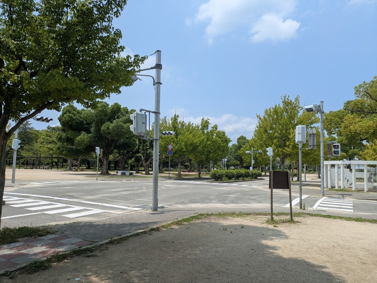公園内に疑似的な道路が形成されてた、信号も動いてないけどしっかりしていて道路も結構広めに整備されてたので、子供とか遊んだらハイパーテンション爆上げするんだろうな、十字路の真ん中で寝れるから、「世界に自分ただ一人になってしまって、途方に暮れて道路の真ん中で寝始めるやつ」もできる。