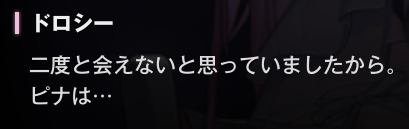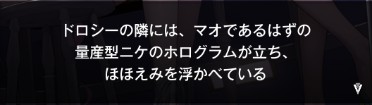 前回はアルフレッドと共に乗客がいなくなってもユートピア号に最後まで乗り続けていた、量産型ニケである、マオがいなくなってからその事実に耐えきれなくなったアルフレッドが生み出したマオのホログラムを探して、アルフレッドの権限を完全に取り戻そうとしてるところに、ドロシーがそのマオと一緒にいると思ったら【ピナ】という名前でその量産型ニケの事を読んでいてわけわかめになったところからだね。