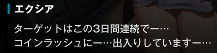 じゃあエクシア、コインラッシュの中でターゲットが何をしていたかわかったりする?