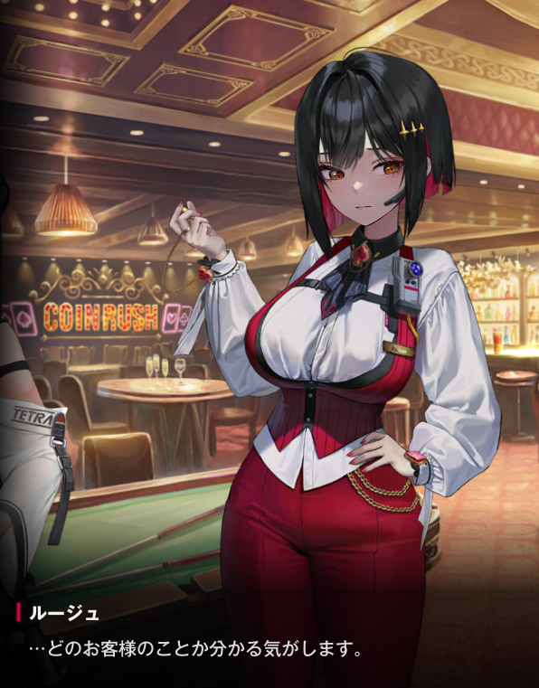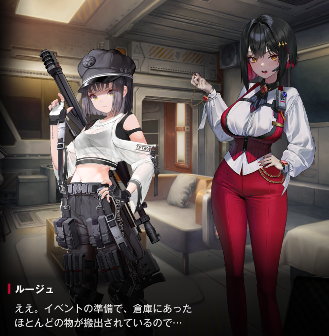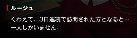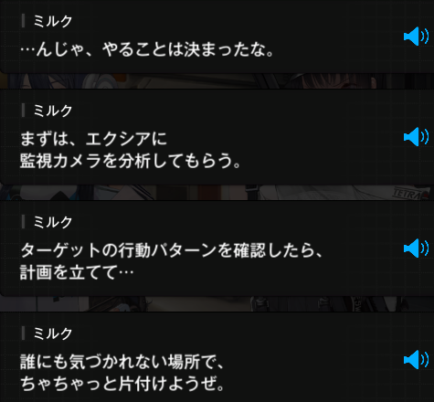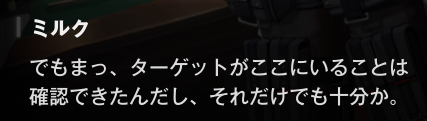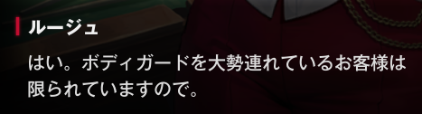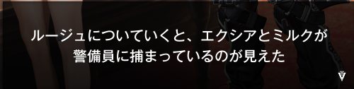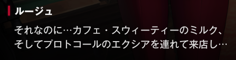 ルージュになぜ、今回のイベントに出る予定がないのに、ミルクとエクシアを連れて、来店したうえで立ち入り禁止のエリアに侵入しようとしたのか、聞かれてるね。