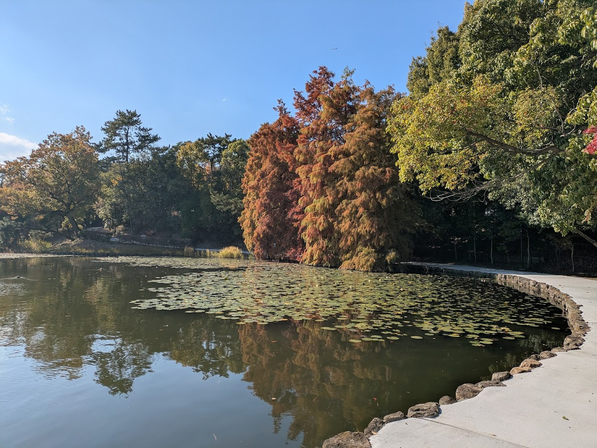 蓮の感じが良いよね、あと紅葉で赤くなった木の葉がきれいだね、素晴らしいですよ。
