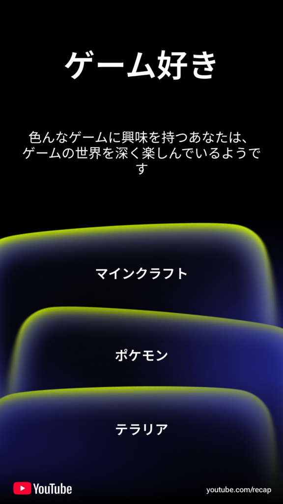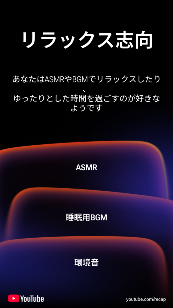 寝るときにASMRをよく見てるからか、Youtubeの見てるジャンルがゲームかリラックス志向に寄ったね。