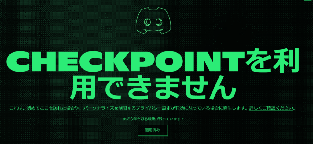 ディスコードの年間まとめとしてCheckPointというものができてたんだけど、ディスコードに情報を渡したくなさ過ぎて、全ての設定を切っていたので見れませんでした。