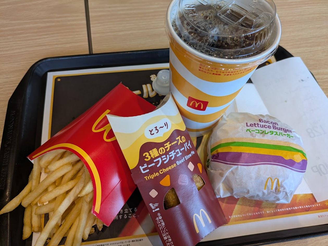 マクドはコーヒーLにビーフシチューパイとベーコンレタスバーガーとポテトL。