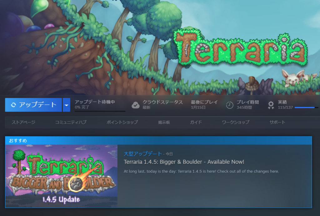 テラリアのアップデートが来ましたね、実績とかもかなりの量、追加されたっぽい。