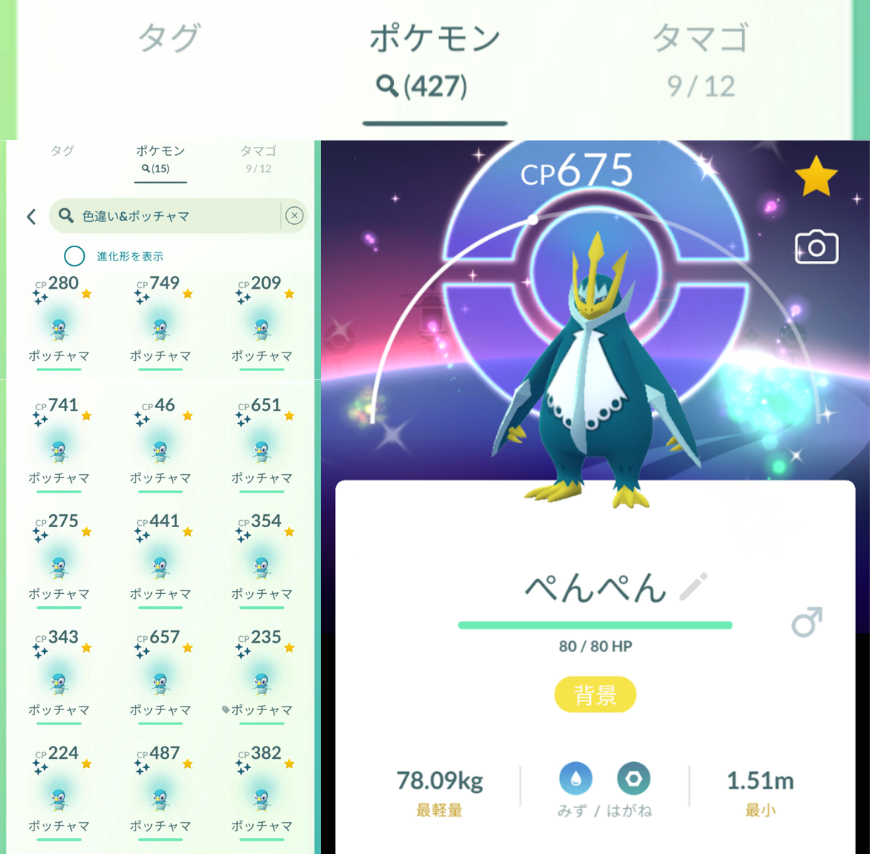 色違いのポッチャマ自体が15匹でポッチャマ全体が427体だね。約 3.51%の確率で色違いが出てる計算、背景色違いは1匹だけだったので、500分の1くらいの確率ってことかなのかな?