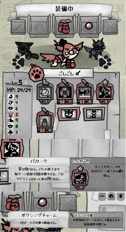 いわゆるローグライクゲームで、4匹の猫ちゃんを連れてゲームを進めていく、それぞれにひとつ役職を決めれて、クレリック(回復役)アタッカーや弓職や魔法職もいる、そしてこのゲーム特有のシステムが一度バトルに参加させた猫は歴戦の猫ちゃんとなりもうバトルには参加させられないというシステムがある、じゃあどうやってステージ攻略していくんだ、というと交配のシステムがある、歴戦の猫ちゃんはステージ攻略をして幾千のバトルを経てレベルが上がってるのでステータスが高くなってる、その歴戦猫ちゃんを交配させたりしてステージをどんどん攻略していこう!というもの。