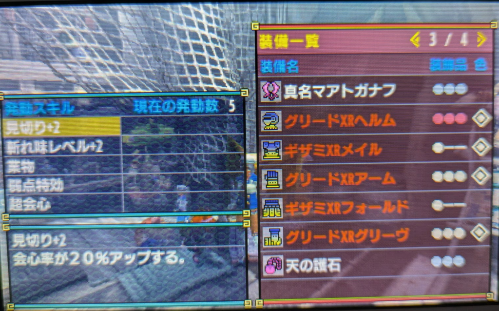 これは、XXの中だと一位二位を争うレベルで有名なテンプレ装備じゃないのかな、見切り+2と弱点特効会心率があってその上、超会心で会心時のダメージを上げれる、業物と切れ味レベル+2で切れ味ゲージが上がる。