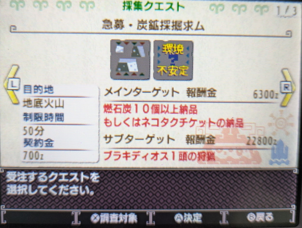 イベントクエスト【急募・炭鉱採掘求ム】サブターゲットであるブラキディオス1頭の討伐を達成したのちに、サブクエ達成をするとお守りがいっぱい貰えるからお守り厳選にすごく良いというもの。