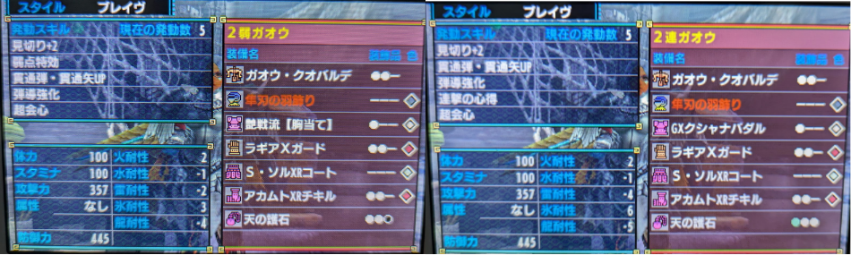 この装備はいわゆるブラキ炭鉱ということをするときに使用するもので、2連というのは見切り+2と連撃の心得で2連見切り+2と弱点特効で2弱となっている。