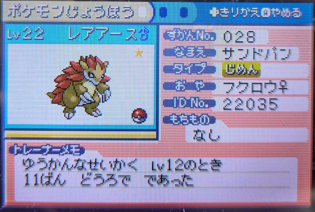 【28】サンドパン【色違い】 2026.03.24 色違い比較 回数9008ゲームリーフグリーン名前レアアース性別♂性格ゆうかん特性すながくれ出会った場所11番道路 USUMをプレイしてた時につけた名前です。由来はかっこいいから。