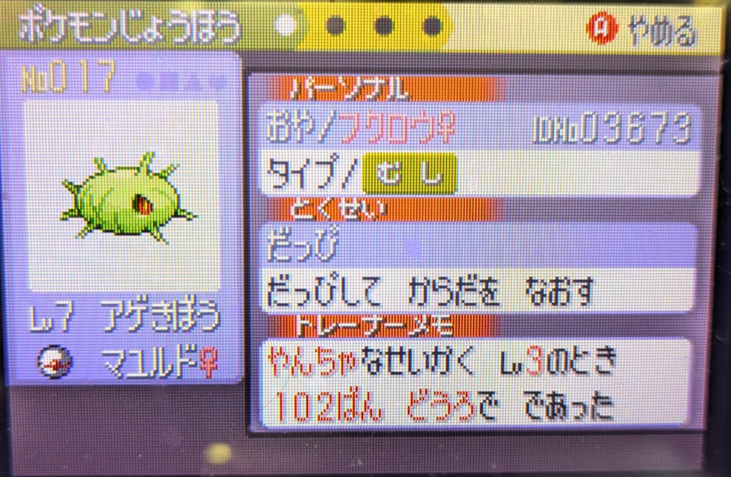 【268】マユルド【色違い】 2026.01.04 色違い比較 回数5880ゲームサファイア名前アゲきぼう性別♀性格やんちゃ特性だっぴ出会った場所102番道路(ランダムエンカウント) マユルド3体目アゲ希望でした。