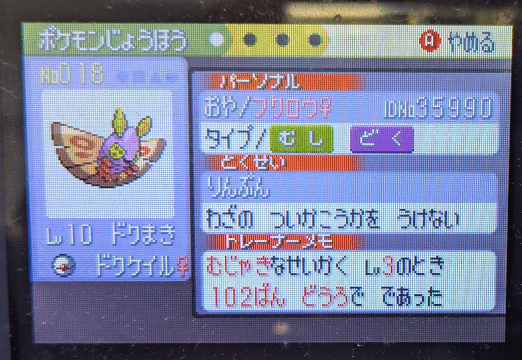 【269】ドクケイル【色違い】 2025.10.17 色違い比較 回数17728ゲームルビー名前ドクまき性別♀性格むじゃき特性りんぷん出会った場所102番道路(ランダムエンカウント) 名前の由来は虫縛りでサファイアをプレイしてた時にどくどくを撒く要因として、重宝していて名前がドクまきだったから、色違いになって転生した。
