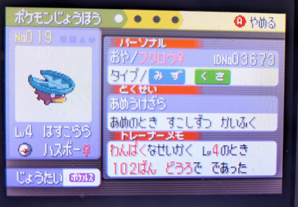 【270】ハスボー【色違い】 2025.10.08 色違い比較 回数2056ゲームサファイア名前はすこらら性別♀性格わんぱく特性あめうけざら出会った場所102番道路(ランダムエンカウント) レベル4HP18攻撃8防御8特攻7特防9素早さ7 名前の由来はハスコラです、Aボタンを押しすぎてはすこららになっちゃった。あとポケルスが移ってた、色違い厳選をしてるとたまにあるよね、ポケルスが付くこと。