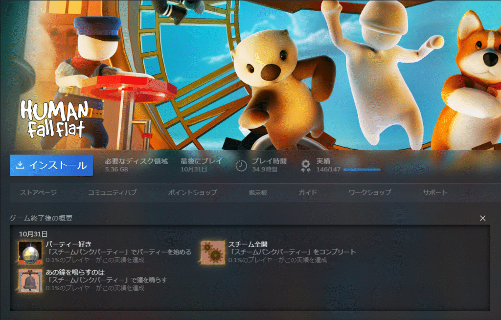 Human fall flatはアップデートで実績が増えてるけど、見かけだけで実はプレイしても取れないみたいなのが、アップデートしたすぐだと起こりやすいゲームなので、少しだけ日を置いてプレイしている、146/147になっているのはなぜか取れなかったから、友達とまた今度やろうという話になった。