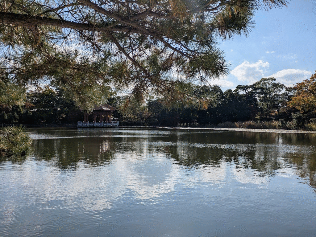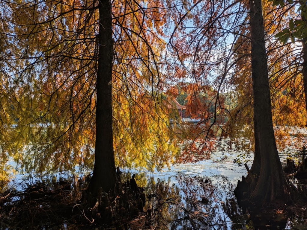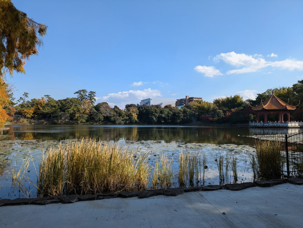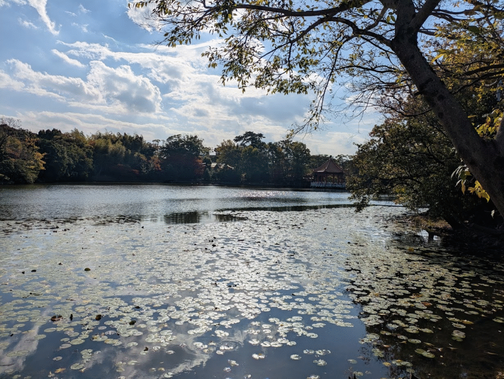 蓮の感じが良いよね、あと紅葉で赤くなった木の葉がきれいだね、素晴らしいですよ。