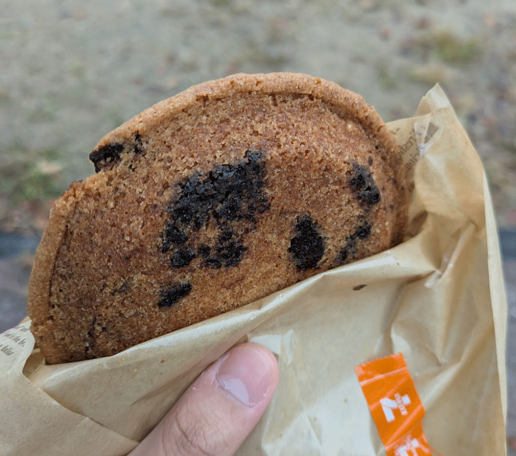 中はしっとりしていて、クック―の周りはサクサクしていて食感もすごく良い、近い食感の物で言うと、タルト生地?が近いかも、めちゃくちゃうまいタルトの生地の部分の食感ですごい美味しかった、味はチョコチップクッキーの高級版って言われて想像する感じの味でした。
