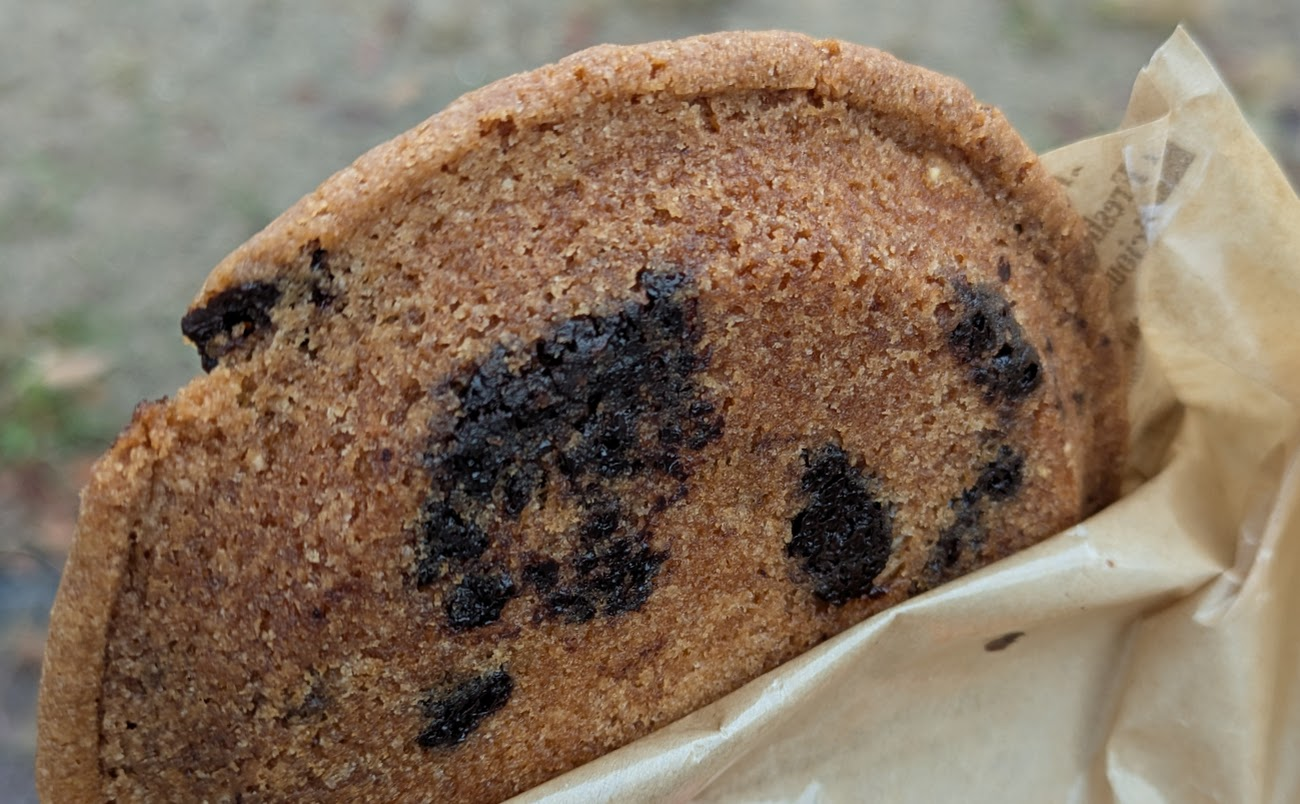 中はしっとりしていて、クック―の周りはサクサクしていて食感もすごく良い、近い食感の物で言うと、タルト生地?が近いかも、めちゃくちゃうまいタルトの生地の部分の食感ですごい美味しかった、味はチョコチップクッキーの高級版って言われて想像する感じの味でした。