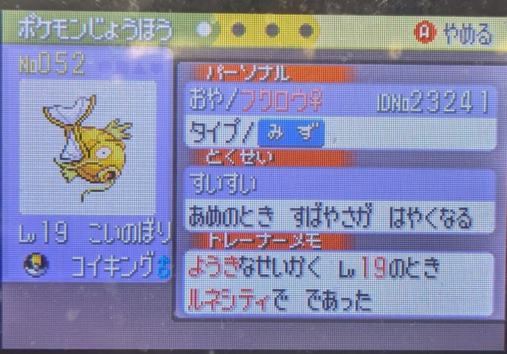【129】コイキング【色違い】 2025.12.09 色違い比較 回数????(ストーリー周回中偶然)ゲームサファイア名前こいのぼり性別♂性格ようき特性すいすい出会った場所ルネシティ マスボ集めのためストーリー周回していたら偶然出会った。